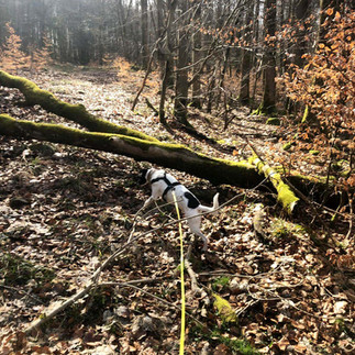 Draußen ist Nero gerne aktiv. Spaziergänge liebt er sehr – oft begleitet von einem kleinen Freudentanz, wenn es losgeht. An der kurzen Leine läuft er gut orientiert mit, genießt aber auch den Auslauf an der Schleppleine und ausgiebige Schnüffelrunden. Besonders wohl fühlt er sich in ländlicher Umgebung mit vielen Möglichkeiten für gemeinsame Entdeckungstouren. Sein Jagdtrieb ist vorhanden, weshalb ein verantwortungsvolles Management draußen wichtig ist. Aktivitäten wie Nasenarbeit oder andere gemeinsame Beschäftigungen könnten ihm viel Freude bereiten.