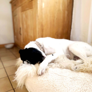 Da Nero für die Behandlung vor allem Ruhe und ein stabiles Umfeld braucht, ist er inzwischen bei uns angekommen und darf erstmal genau das: ankommen, runterfahren und Vertrauen fassen. Die Vergesellschaftung mit den vorhandenen Hunden verlief gut, nun steht für Nero vor allem eines im Vordergrund: Stress reduzieren, Sicherheit erleben, Struktur bekommen.